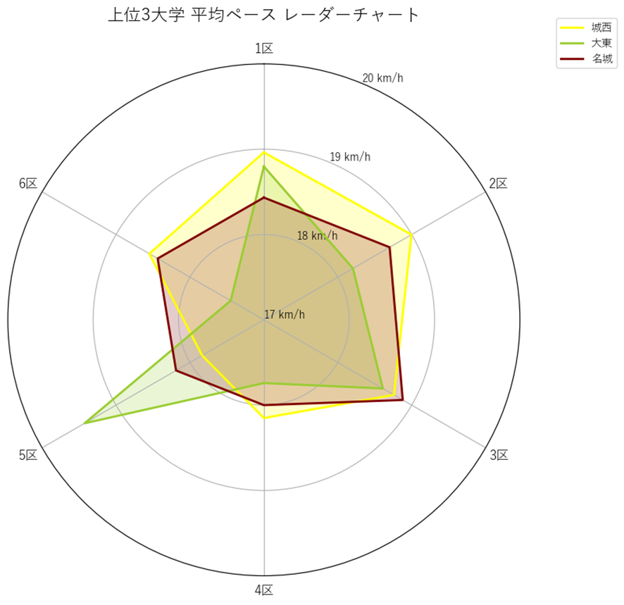 レーダーチャートより、城西大学は、6人の総合力で優勝を勝ち取ったことがわかります。