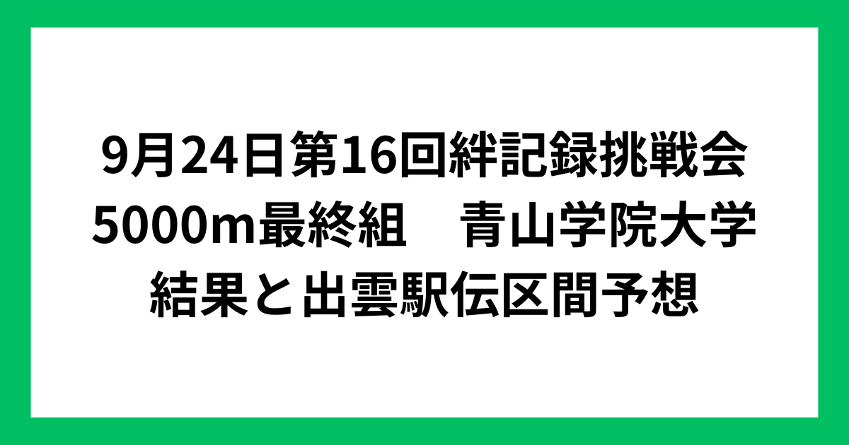 今回は本日9月24日(水)に行われました、絆記録挑戦会の5000m第6組の青山学院大学の選手の結果の振り返りと、それを踏まえた出雲駅伝の区間予想をしていきたいと思います。